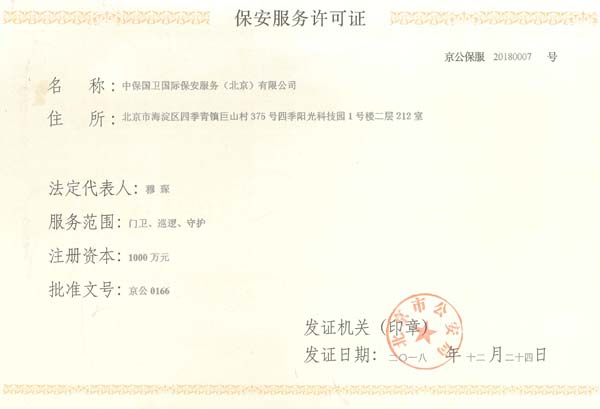 中保國衛(wèi)國際保安服務(wù)(北京)有限公司,屬中保國衛(wèi)集團(tuán)旗下子公司。能全方位的為大型客戶提供優(yōu)質(zhì)的安保、押運服務(wù),是集人防和技防于一體的新型正規(guī)化綜合安保押運服務(wù)企業(yè),提供人防、物防、技防、聯(lián)網(wǎng)報*、非武裝押運等安防相關(guān)的一站式服務(wù)。 公司在國內(nèi)多省設(shè)立有分公司及分支機構(gòu),著重提升安全押運、智能技術(shù)押運及安全技術(shù)防范相關(guān)的服務(wù),業(yè)務(wù)范圍覆蓋全國一、二線城市、港澳地區(qū)以及海外地區(qū)。安保方面主要為政府機構(gòu)、金融機構(gòu)、企事業(yè)單位、醫(yī)療衛(wèi)生、高等院校、工業(yè)園區(qū)、大型商場、高檔住宅、智能商務(wù)樓、大型活動提供門衛(wèi)、守護(hù)、巡邏、押運(非武裝)、安全檢查、保安特勤、私人護(hù)衛(wèi)、消防中控、安全技術(shù)防范、遠(yuǎn)洋護(hù)航等全方位服務(wù),同時面向國際市場,為中資企業(yè)在“一帶一路”沿線國家投資提供境外安保服務(wù)。 >> 更多內(nèi)容 |